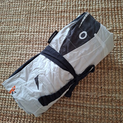 alareunassa on nauhat, joilla unipussin voi solmia tiukaksi rullaksi, jotta pussi kulkeutuu mukana mahdollisimman helposti
