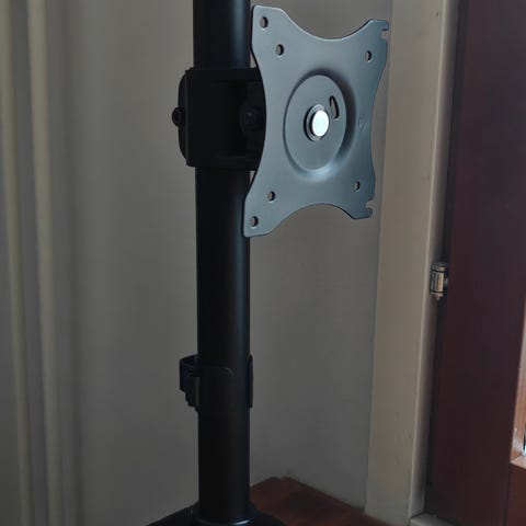 Musta näytön pöytäteline, jossa on säädettävä varsi ja kiinnityslevy näytölle. Teline kiinnitetään pöydän reunaan puristimella. Soveltuu litteän näytön kiinnittämiseen ja korkeuden sekä etäisyyden säätämiseen työpisteellä. Itsellä on ollut tässä kiinni 27” ja 38” kokoisia näyttöjä. VESA 100 x 100 kiinnitys.