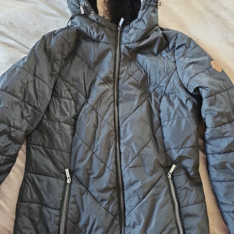 Future Sport naisten takki, koko XL. Väri musta. Edessä tikattu, kevyesti topattu osa ja sileät hihat sekä takaosa. Takissa on vetoketjukiinnitys edessä ja vetoketjulliset sivutaskut vetoketjun vieressä on alas asti menevä heijastin näkyy kuvissa Kiinteä huppu. Sopii arki- ja vapaa-ajan käyttöön.