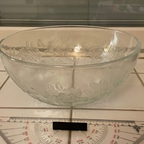 Pyöreä kristallinen tarjoilulautanen, jossa on koristeellinen kaiverrus. Lautasen reunat ovat aaltomaiset ja siinä on monimutkainen kuviointi. Halkaisija 26cm.