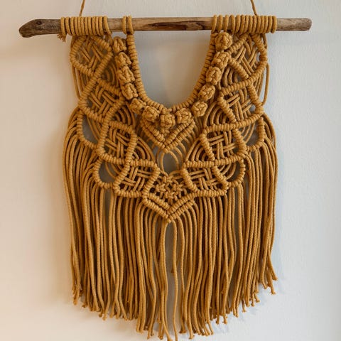 Itse tehty makrame luonnonvalkoisesta langasta, korkeus puusta alimpaan hapsuun 125cm ja puun pituus 85,5cm. Laudan saa irrotettua halutessaan ja sivunaruista tällöin tehtyä ripustusnarut makrameelle, on pidetty kummallakin tavalla.