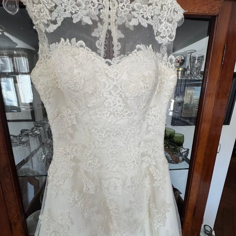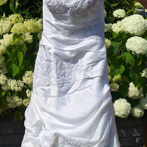Olkaimeton, Ivory häämekko, siististi säilytetty. Yksinerkainen ja elegantti kerrostetulla helmalla ja kauniilla yksityiskohdalla. Siro 36-38 kokoa. Pesetetty. Mukaan saa ilmoituksen tiaran.