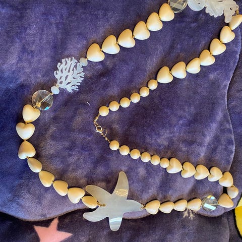 Poikkeuksellinen kullanvärinen kaulakoru, jossa kymmenen simpukankuorta ja muuta merenaarretta. Harvinaisuus. Vahva lukitusmekanismi. Käyttämätön, uusi.