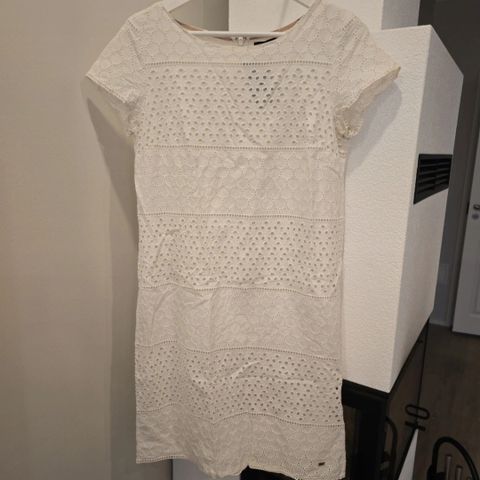 Punainen, pitkä sifonkimekko, jossa pitsikoristeltu yläosa ja läpikuultavia yksityiskohtia. Kapea yläosa ja leveästi laskeutuva helma. Selkäpuolella ristiin menevät olkaimet ja vetoketjukiinnitys. Sopii juhla- ja iltatilaisuuksiin.