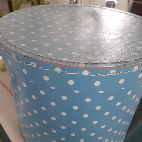 Yksinkertainen nauhoilla kiinni solmittava hattulaatikko. Tukevaa pahvia. Hyvä kunto. Voi pinota muiden laatikoiden kanssa torniksi