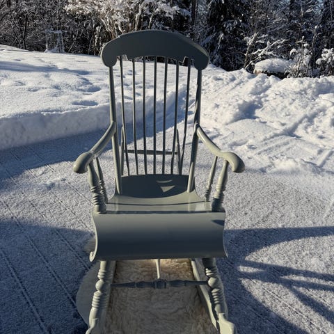 Tumman ruskea puinen keinutuoli hyvässä kunnossa. Noudettava.
