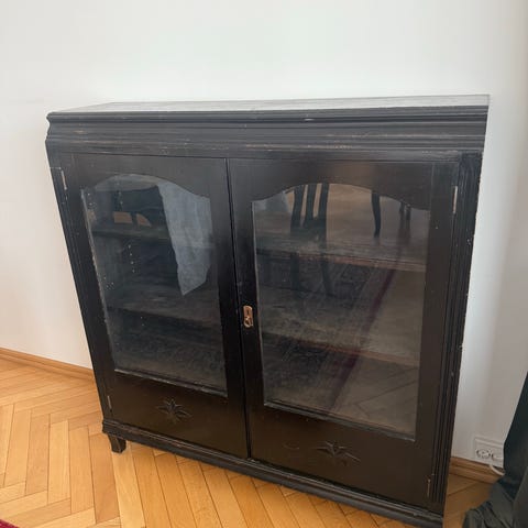 Komea vanhan ajan astiakaappi etsii uutta kotia. Yläosa irroitettava. Keskellä liukulasivitriini yhdellä lasihyllyllä. Laseissa pari pientä kolhua. Yläosan kaappiin löytyy avain ja lukot toimivat. Alaosaan ei avainta. Rakenteeltaan kaikin puolin tukeva. Sisusta siisti eikä ole hajuja.