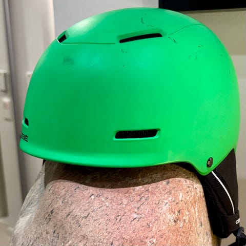 Cébé kypärä, koko 54–56 cm. Vihreä ulkokuori, sisäpuolella pehmustetut korvaosat ja hengittävä sisävuori. Leukahihna säädettävällä soljella. Paino noin 600 g. Kypärä on CE- ja UKCA-hyväksytty standardin EN 1077:2007 mukaisesti, soveltuu talviurheiluun kuten lasketteluun ja lumilautailuun. Päälaella kulumajälkiä, jotka ovat tulleet laskulaseista