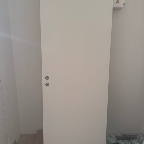 Annetaan valkoinen swedoor sisäovi, jossa metallinen ovenpainike ja avainpesä molemmin puolin. Ei karmeja. Ovi on sileäpintainen ja suorareunainen. Sopii käytettäväksi sisätilojen huoneenovena. Kuvissa näkyy joitakin kolhuja ja kulumia oven pinnassa sekä reunoissa. Ovi ei ole uusi ja käytönjälkiä siis myös osittain, mutta perussiisti olisi. Saranat myös paketissa mukana. Tähän ei ole avainta.