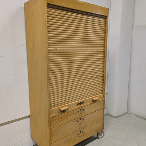 Tyylikäs vintage rulokaappi myytävänä. Kaappiin asennettu kätevät pyörät, joiden ansiosta sitä on helppo tarvittaessa liikutella. Ajan tuomia jälkiä kannessa ja muutamia kyljessä. Rulo ja vetolaatikot toimivat hyvin. Ei avainta ja lukko poistettu käytöstä. Sisusta siisti eikä ole hajuja. Sisustasta poistettu aikanaan osia ja nykyisin pelkät kiinteät hyllyt paikallaan.
