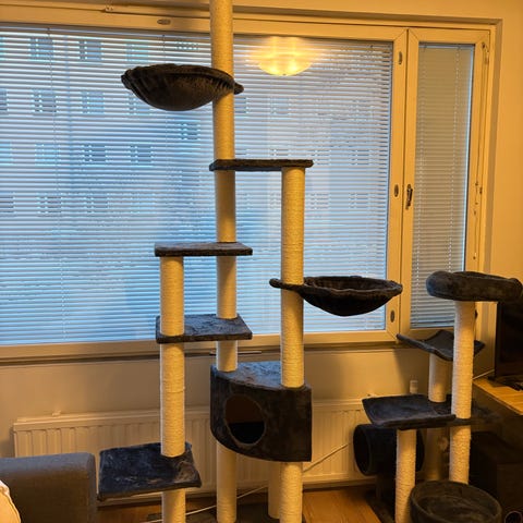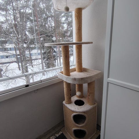 Ollut käytössä vajaat 2 vuotta. Pientä käytön jälkeä näkyy tolppien köydessä, mutta ei muualla. Hyvä pieni raapimispuu esim. kissanpennulle.