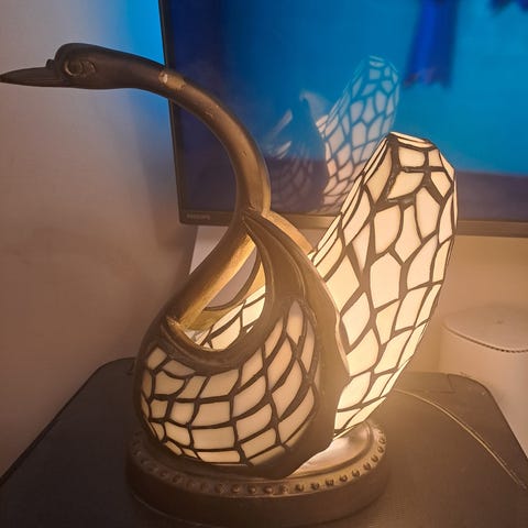 Tiffany pöytälamppu, iso tähti ja takorauta varsi. Kokonaiskorkeus 69cm ja leveys 35cm. Katkaisin johdossa, lampunkanta E14. Näyttävä valaisin.