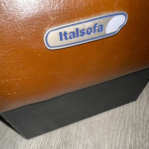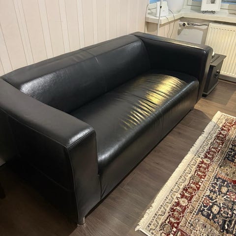 LuxCasan nahkasohva ja tyynyt, verhoilussa kulumaa ja repeämää parissa kohtaa.