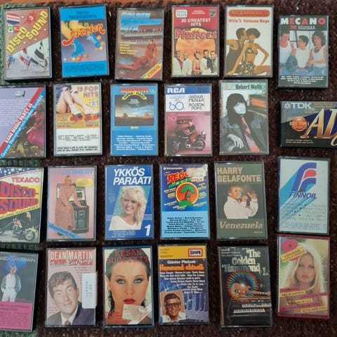 Erilaisia kasetteja, kunto vaihtelee. Tee tarjous ja hae pois, sis telineet.