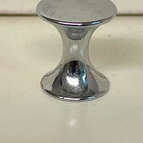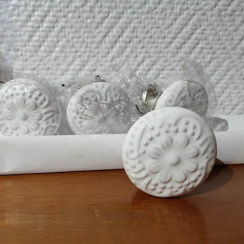 Valkoinen peltinen vetonuppi kaappeihin tai laatikoihin. Pyöreä malli, jossa leveä yläosa ja kapea jalka. Alaosassa ruuvinreikä kiinnitystä varten. Sopii esimerkiksi keittiökaappien, lipastojen tai muiden säilytyskalusteiden vetimeksi.