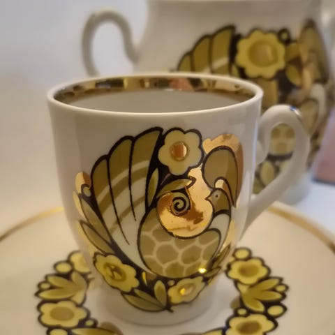 Kiinalainen posliini tee- tai lattekuppi kultaisilla reunoilla, saari kultaa