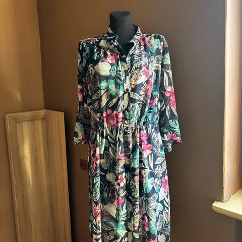 ELLOS kaunis alaspäin levenevä tunikamekko. Koko 50/52, kai-kai 65cm x 2, oh 103cm. Miellyttävä ja tarvittaessa runsaasti joustava materiaali. Kai-kai joustaa helposti jopa 10cm. Kunto priima.