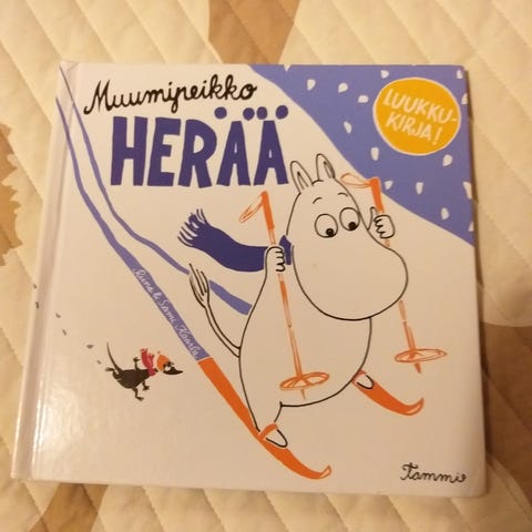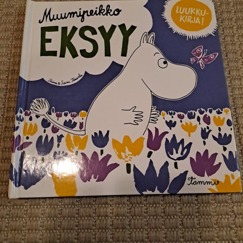 Muumipeikko lentää luukkukirja. Kannessa vikaa, siitä kuva. Yhtä luukkua vähän teipattu ja luukkuja taitettu. Näistä kuvat.