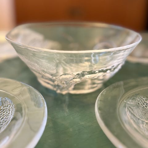 Arabia lasikulhot ja lautaset kirkasta lasia. Astioissa on kohokuvioitu kasviaiheinen koristekuvio. Sopivat esimerkiksi jälkiruoka- tai tarjoiluastioiksi. Myydään settinä, jossa useita pieniä kulhoja ja matalia lautasia samasta sarjasta. Sisältää 8 kappaletta Nuutajärven Pioni-lautasia, 4 kappaletta Nuutajärven tarjoiluastiaa ja 3 kappaletta Arabian syviä lautasia. Voit myös tarjota hintaa!