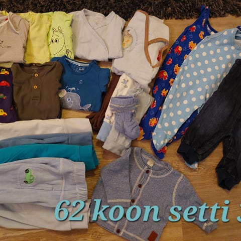 Sekalainen setti 60-68 cm vauvan vaatepaketti. Hello kitty valkoinen body ja pipo käyttämättömät, kaikki muut paljon käytettyjä ja jo kuluneita, mutta ehjiä. Käytetään hajustettuja pesutuotteita.
