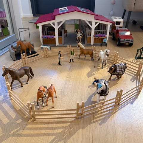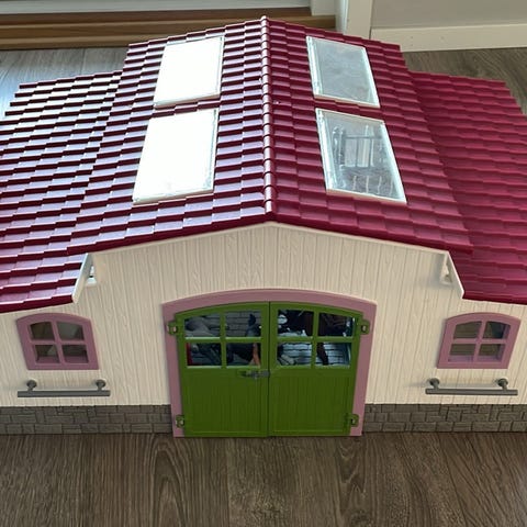 Schleich Horse Club hevostalli leikkisetti. Pakkauksessa on kaksikerroksinen hevostalli aitauksineen sekä useita pieniä osia, kuten hevoshahmo, ihmishahmo, satula, suitset, ruokinta- ja hoitotarvikkeita sekä koristeosia.