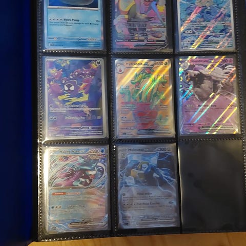 Pokemon korttikansio, jossa useita Pokemon-kortteja muovitaskuissa. Kansio soveltuu keräilykorttien säilyttämiseen ja järjestämiseen. Korteissa on erilaisia Pokemon-hahmoja ja kuvituksia, osa korteista on holografisia tai erikoisversioita. Kansiolla voidaan säilyttää useita sivuja kortteja, ja se suojaa kortteja kulumiselta ja taivutuksilta. Sopii Pokemon-keräilykorttien säilytykseen ja kokoelman esillepanoon.