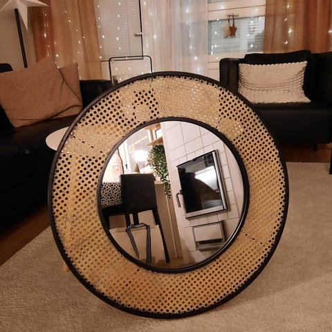 Pyöreä peili seinälle, halkaisija 65cm. Mustat metallireunat. En huomaa käytönjälkiä.