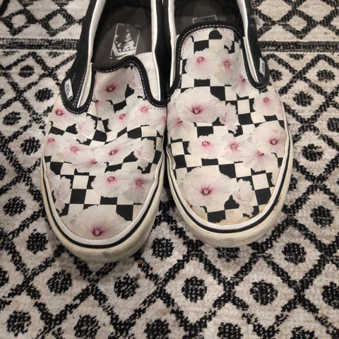 Vans tennarit, koko 43. Matala malli nauhoituksella. Päällinen vaaleaa kangasta, sivuilla siniset ja pastellisävyiset yksityiskohdat. Valkoinen kumipohja, jossa perinteinen Vans-kuviointi. Soveltuvat arkikäyttöön vapaa-ajalla 5e.