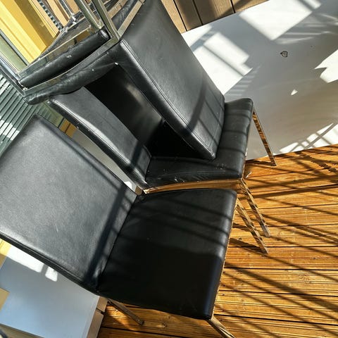 Yhteen tuoliin tehty uusi verhoilu mutta jäi tekemättä muihin tuoleihin.