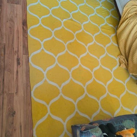 Valmistuksesta poistunut ihana keltainen villamatto 💛 pari tummempaa kohtaa, ei ole yritetty tahran poistoa, normaalisti pesty viime kesänä jonka jälkeen ollut vain pari viikkoa lattialla.