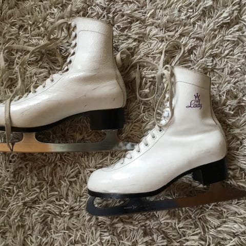Ruskeaksi aikanaan maalatut Riedell-luistimet ilman teriä.