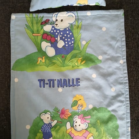 Nuken tilkkupeitto on 28x37cm kokoinen ja tyyny 13x18cm. Päällisen kankaat ovat käyttöottopestyä, uutta puuvillaa. Taustalla fleeceä ja välissä ohutta levyvanua, joka on tikattu tiheästi tilkkupäälliseen. Tyynyn täytteenä on vanua. Nukenpeitto nuken petivaatteet nuken vuodevaatteet Laura Ashleyn ruusukangas nukenvaunut nukensänky käsityöt tilkkutyöt