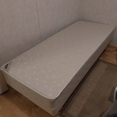 Kotimainen, laadukas, tukevatekoinen joustinsänky. Koska sänky on korkeaa mallia, se soveltuu hyvin vanhuksille, liikuntarajoitteisille jne. Pinnat ovat muutoin lähes virheettömät lukuunottamatta toisen reunan valkoisessa osassa olevia värivirheitä (kuva 5).