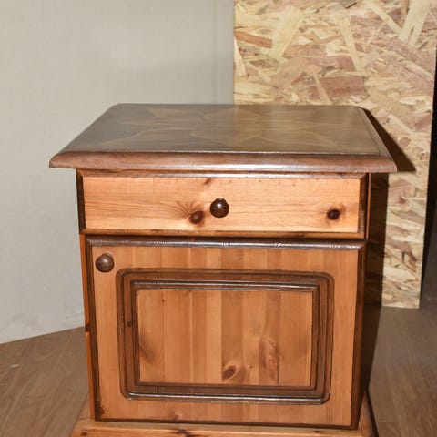Puu yöpöytä ja lipasto metallivetimillä