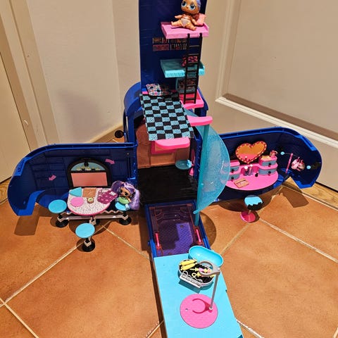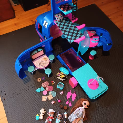L.O.L. Surprise asuntoauto. Leikkisetti muistuttaa avattavaa asuntoautoa, jossa on useita eri leikkialueita sisäpuolella. Auton sivut ja katto avautuvat, jolloin esiin tulee huoneita ja leikkitiloja nukeille. Värit ovat pääosin hopea, pinkki ja sininen. Sopii L.O.L. Surprise -nukeille ja vastaavan kokoisille leluhahmoille. Nouto Siilinjärveltä.