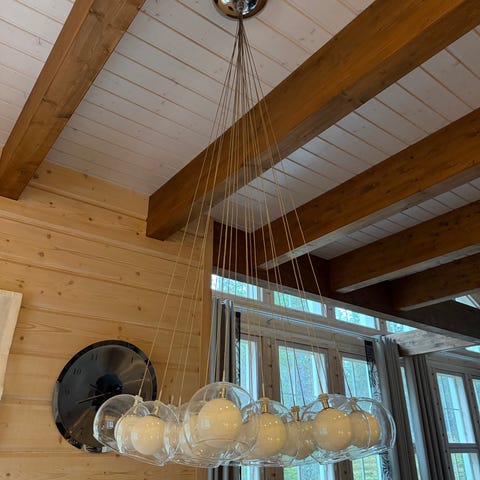 Lamppuliikkeestä ostettu valaisin. Korkeus katosta alimpaan lasikoristeeseen 56cm.