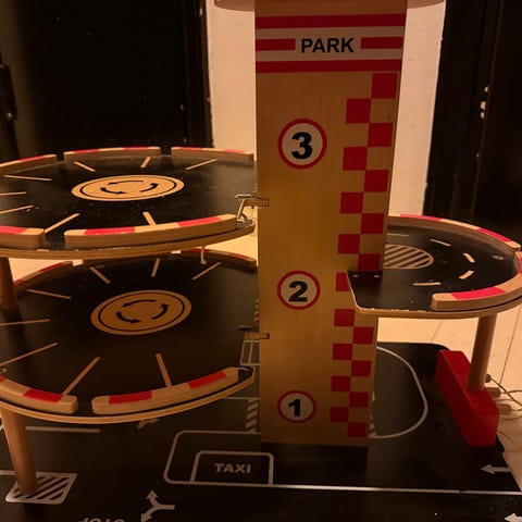 Hape parkkitalo, puinen. Paljon leikitty, kolhua on, mutta vielä seuraavalle hyvä lelu. Sisältää kaksi puista autoa.