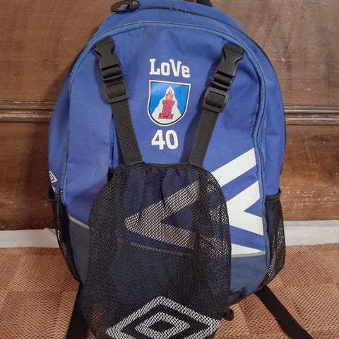 Jalkapallo reppu. Paikka pallolle, juomapullolle yms. Kaikki vetoketjut ehjiä ja hyvä käyttökelpoinen reppu seuraavalle futaajalle.