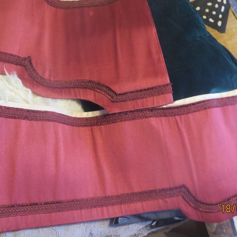 Tunnetun englantilaisen Patricia Guildin malliston sisustuskankaasta ompelijalla teetetyt verhot ja verhokapat, jotka ruokailuhuoneen käyttötarkoituksen muututtua jäivätkin käyttämättä:
