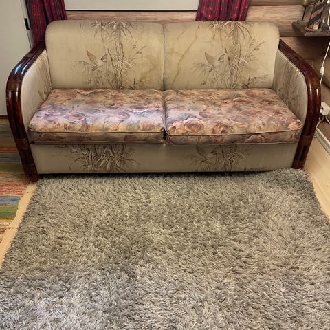 Uuteen kotiin tukeva vuodesohva. L 184cm, S 81cm. Makuupatjan koko L 113cm, Pituus 150cm. Mahtuu leveempikin patja. Ehjä, pesu tekis hyvää.