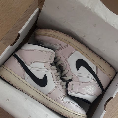 Air Jordan 1 Mid SE tennarit, koko 42,5. Väritys vaaleanpunainen, harmaa ja valkoinen. Keskikorkea varsi, nauhakiinnitys ja kumipohja. Päällinen nahkaa ja tekstiilimateriaalia. Alkuperäinen (original) Nike, ostettu Zalandolta. Kuitti tallessa. Mukana alkuperäinen laatikko.