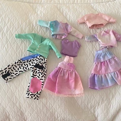 Iso osa vaatteista on japanilaisen Takaran, takeissa on hieman kulumaa. Vaaleammassa takiss aon kulumaa mm etuosan rusetissa, tummemmassa on kulumaa tarranauhassa ja sisäkankaassa sisäpuolella.