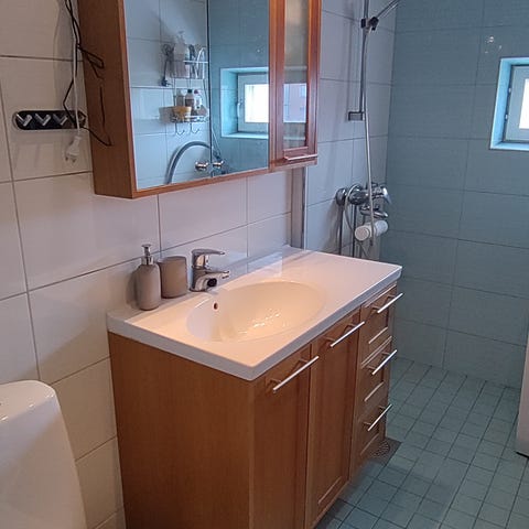 Annetaan Ikean valkoinen allaskaappi. Kaapissa näkyy kulumajälkiä (kuvassa). Lisäksi ovessa pieni kolhu sekä ’etulistassa’ pientä jälkeä. Itseä nämä ei ole haitannut käytössä, kun jää altaan alle piiloon. Annetaan muuton tieltä pois.