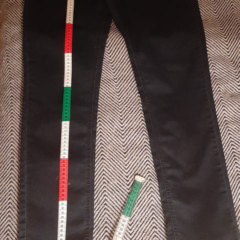 Mustat farkut,koko 46, vyötärön ympärys 103,5 cm, materiaali puuvillaa 84 %, polyesterä 14 % js elastaania 2 %. Katso mitat ja pesuohjeet kuvista.