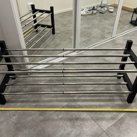 Hyväkuntoiset Ikean kenkäteline ja seinään kiinnitettävä hattuhylly.