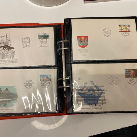 Suomen ensipäivänkuorten ja postimerkkien kokoelma. Kokoelma sisältää useita eri aiheisia ja eri vuosilta olevia ensipäivänkuoria, joissa on postileimat ja niihin kuuluvat postimerkit. Kuoret ovat pääosin valkoisia, ja niissä on erilaisia grafiikoita ja leimoja. Sopii filatelian harrastajalle kokoelman täydentämiseen tai lajitelmaksi.
