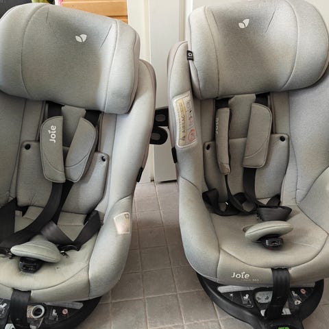 Joie turvaistuin, harmaa. Istuimessa on säädettävä selkänoja ja pääntuki sekä pehmustetut valjaat. Kiinnitys tapahtuu selkä menosuuntaan tai kasvot menosuuntaan auton turvavyöllä ja istuimessa on selkeät merkinnät asennusta varten. Asennus onnistuu kasvot menosuuntaan myös isofix kiinnityksellä. Alusta ei käänny. Soveltuu max. 36kg asti. Materiaalina on pehmustettu kangas ja muovinen runko. Istuimessa on irrotettavia pehmusteita lapsen kasvun mukaan. Istuin on ostettu ja otettu käyttöön 05/2022