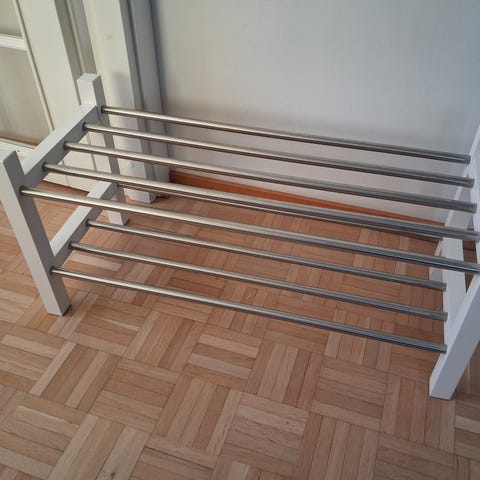 Valkoinen kenkähylly metallisilla tangoilla. Kaksi tasoa, tukeva ja siistikuntoinen. Sopii hyvin eteiseen ja säästää tilaa.