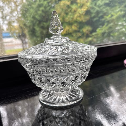 Hakusanat: koriste-esine, Paketoitava, leikkauskuvio, juhlakattaus, klassinen tyyli, kirkas kulho, koristekulho, kannellinen kulho, kristalli, lasikulho, kristallikulho