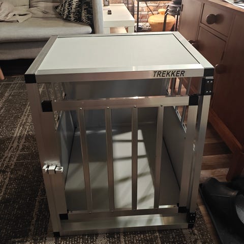 Tästä laadukas autohäkki. Ollut T5 Transporter. Leveys 115cm. Korkeus 100cm. Syvyys 105cm. Jalustan korkeus 23cm. Säädettävä väliseinä. Molemmille puoliskolla yhteinen "hätäpoistumisluukku".